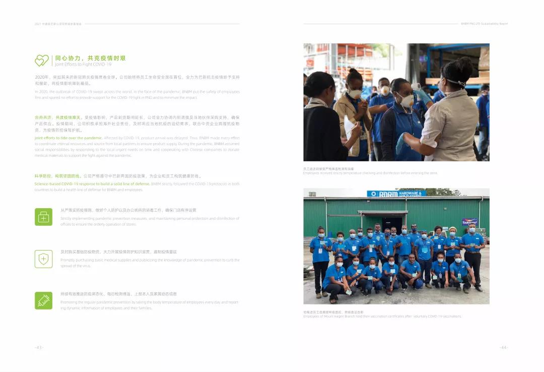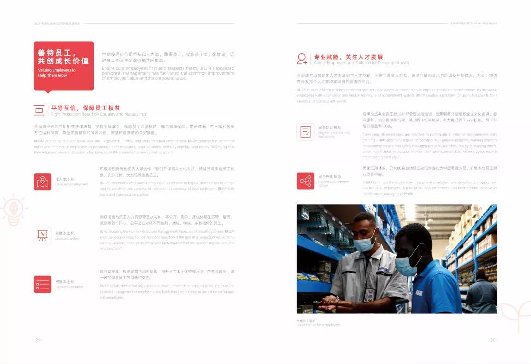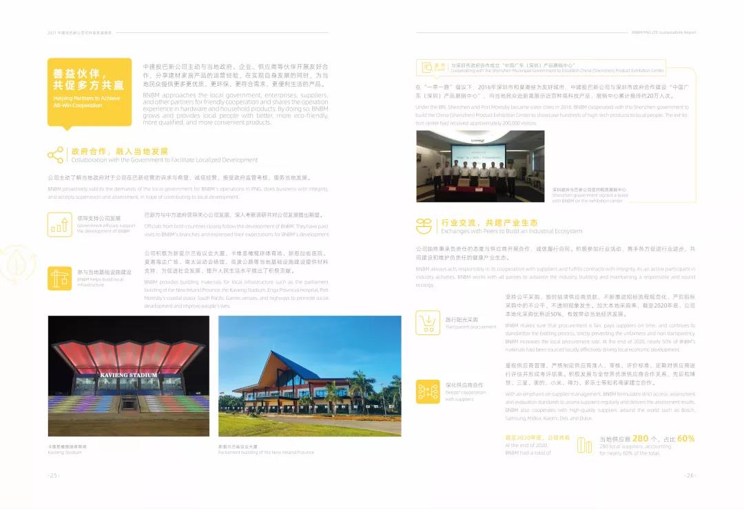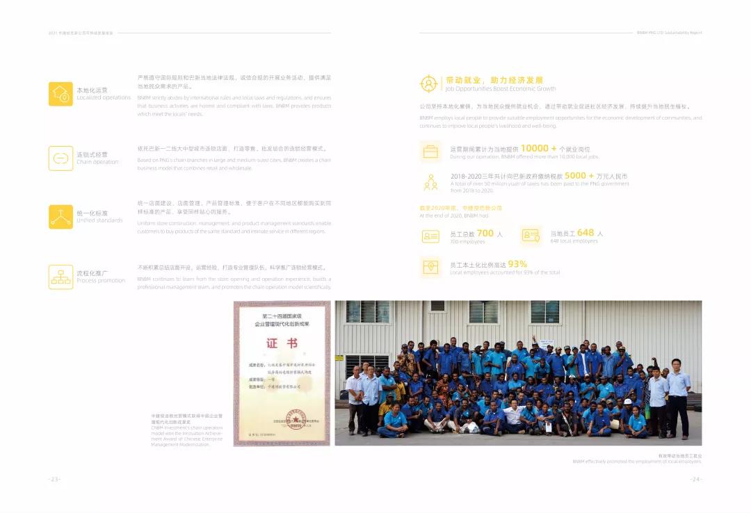 报告以“善用资源 携手共建美好未来”为主题,从善用资源、善益伙伴、善待员工、善汇文化、善惠社区、善对自然六个方面,系统披露中建材投资深度融入“一带一路”建设,认真践行中国建材集团国际化战略部署,秉持“材料创造美好世界”的企业使命,紧密围绕巴新社会经济发展需求,大力发展建材家居连锁业务,以负责任和可持续的方式开展经营,打造和谐友好的中巴新命运共同体,成为两国互利合作的典范企业。